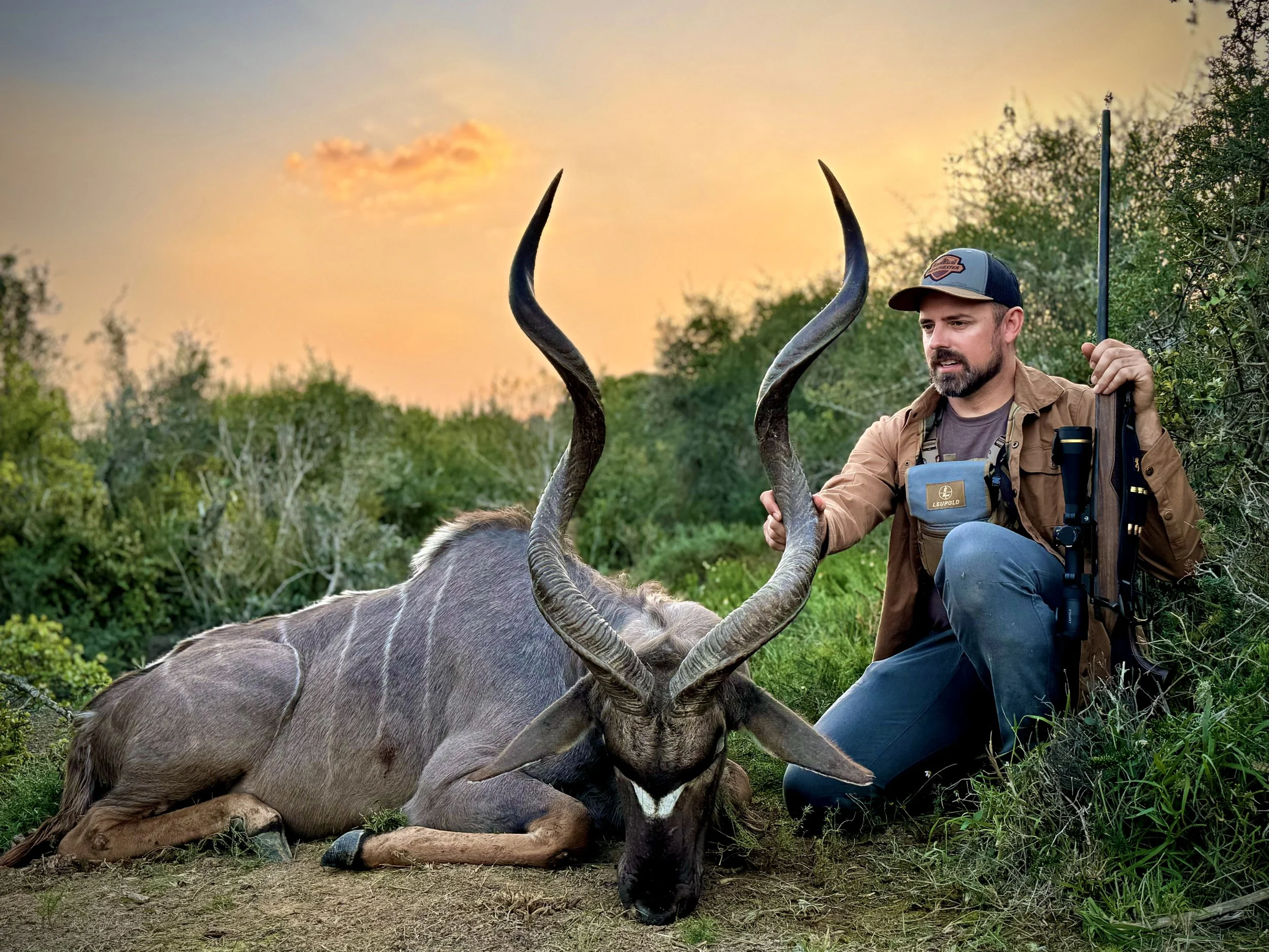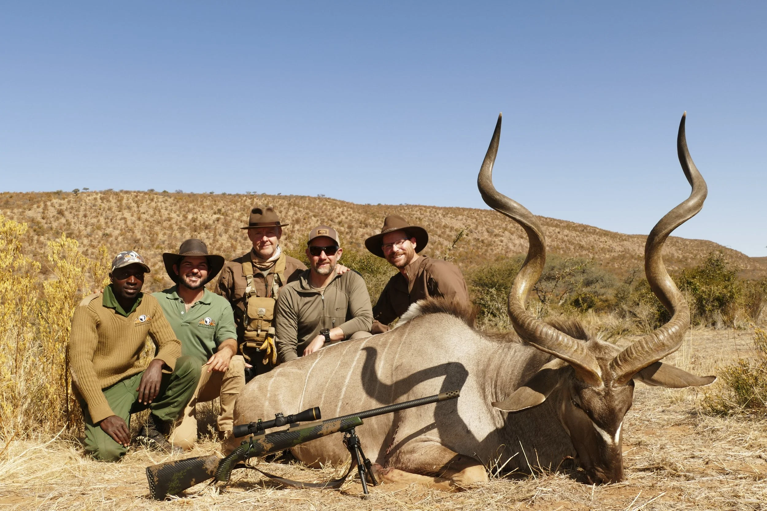 If you want to hunt a world-class free-range Southern Greater Kudu, Kowas Hunting Safaris (pronounced “Kohvahs”) is the best there is. Their area is comprised of 420,000 acres of mountainous kudu habitat populated with some of the best genetics in all of Africa. This region on the edge of the Kalahari desert is truly the promised land for Kudu. The operation is family owned and run by the Strauss’s, who are known for leadership in conservation and for being part kudu themselves. No man alive is better at finding and effectively hunting monster bulls than Jacques Strauss, who heads up Kowas. Note: The giant kudu bull in this section header was shot by Adam Weatherby while hunting with Kowas. Jacques is also an ice-cold, unerring shot in the face of a Cape buffalo charge. Ask us how we know.